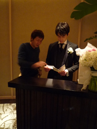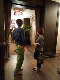 右上写真はモデルのジョンです。どうやら、宅間さんとフロント受付業務ごっこをしている様子。。。
