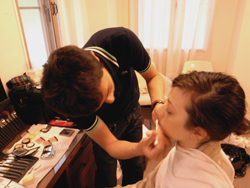 まずは宅間さんのメイクから始まります。今回はハーフのモデルさん、エイミー.どんなヘアもドレスも着こなすことができそうです。どんな作品ができるか楽しみです!