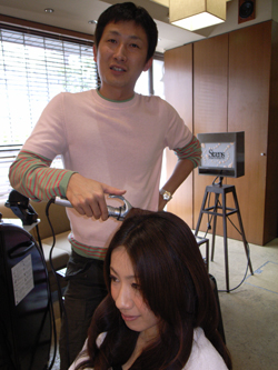 そしてメインのヘアにかかります。メイクも順調にすすみ余裕を見せる宅間さんです。コテでロングの髪を大きく巻いてフワフワウェーブに。。春を感じさせるスタイルですね。
